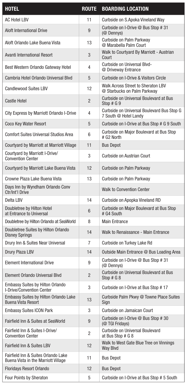 At the Orange County Convention Center, shuttles will pick up and drop off at the North, South and West Buildings. Signs are posted at the hotels on the shuttle routes and the Orange County Convention Center indicating the schedules, routes, and loading/drop-off points.