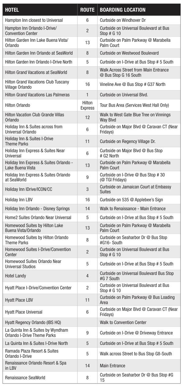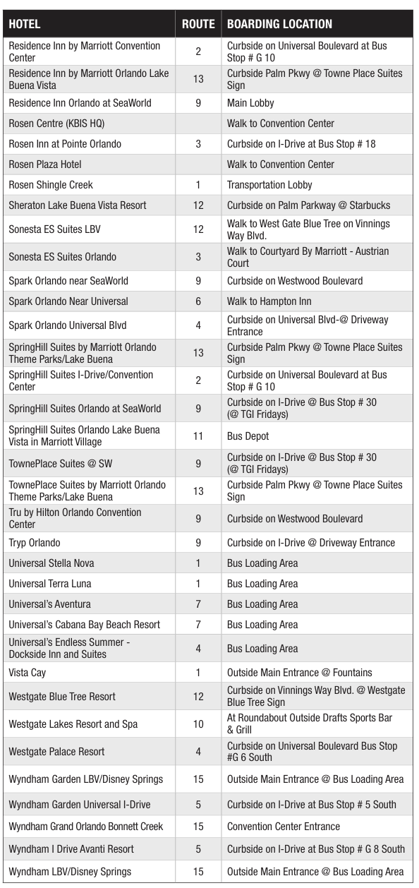 Complimentary shuttle bus service are provided between the Orange County Convention Center and the hotels in the KBIS hotel block (excluding hotels designated as within walking distance of the convention center).